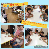 みんなで氷遊び🧊をしました。お花🌸が入った氷に子ども達は「可愛い🩷」と言ってとっても喜んでいました。だんだん溶けてお花が出てきたら、お花の色水で机にお絵描きをして楽しみました。😊梅雨時期も室内で楽しく過ごしました。