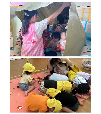 七夕会をしました。お星さまをぺたぺた貼ると、素敵な天の川になりました。膨らむ天の川に「うわ〜!」喜ぶ子ども達。みんなで天の川にボールを投げて落ちてくるボールを追いかけたりして楽しく過ごしました