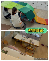 9月は引き渡し訓練をしました。地震の合図で中央に集まり、みんなでダンゴムシポ-ズをしています。毎月避難訓練をしているので、だんだんと素早く出来るようになってきました。先生から渡してもらった靴も履いて避難しましたよ。