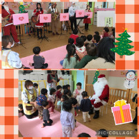 ママさんバンド「リトルピーチさん」にお越し頂き、クリスマスコンサート♪をしました。子ども達の大好きなアンパンマンやはたらく車等、演奏してもらい、大喜びです。タンバリンや鈴を振って子どもたちも一緒に参加させてもらいましたよ♪音楽を聴いて楽しい時間を過ごしました。