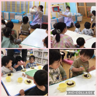午後のおやつ「ブラウニーの日」先生がブラウニーを作る真似っこをしました。材料を混ぜわあせて、レンジに入れると。。美味しそうなブラウニーが出てきました。それを見た子どもたちは大喜び。カラーシュガーやホイップクリームのトッピングを先生と一緒に楽しみました。💓自分でトッピングして食べるブラウニーはとっても美味しかったよ